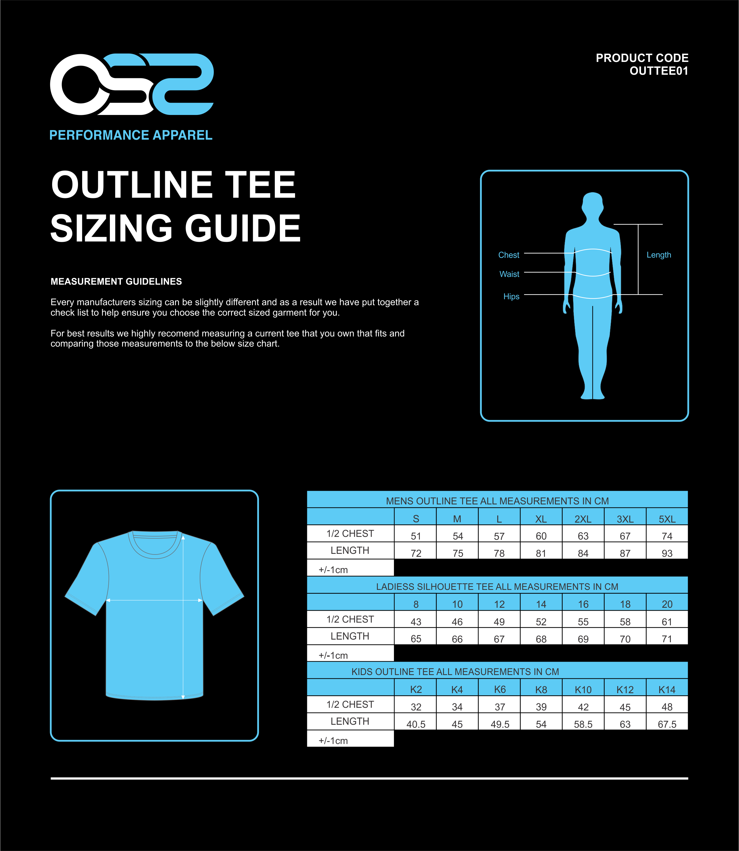 1/2 chest: The best way to measure is to get a tee that currently fits and lay it down flat like the attached chart and measure approximately 1cm below the armpit from side to side.The 1/2 chest measurement is the most important in regards to achieving the correct fitting garment.