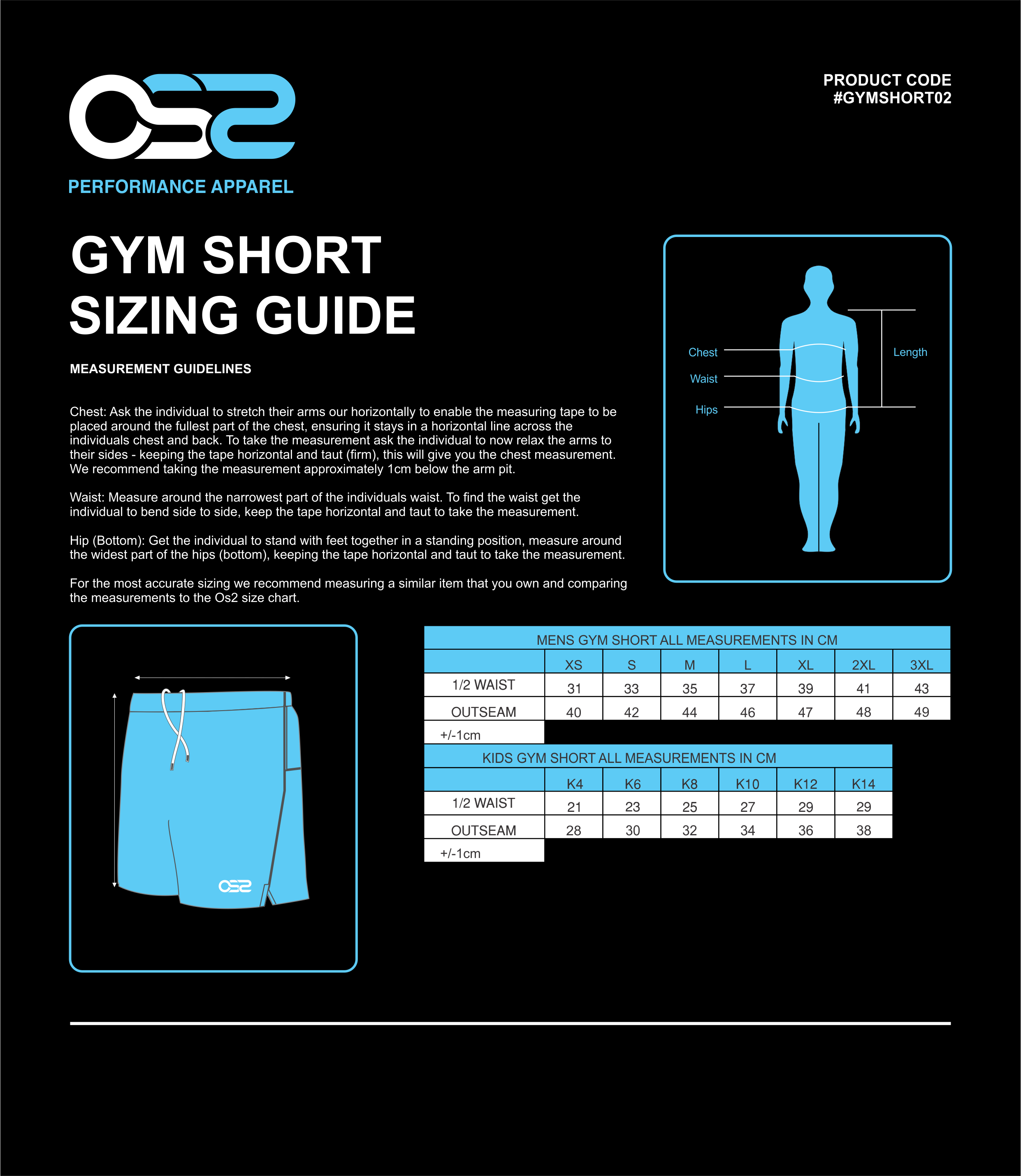 Chest: The best way to measure is to get a pair of shorts that currently fits and lay it flat down like the attached chart and measure the waistband width and length as per size chart. The 1/2 waistband measurement is the most important in regards to achieving the correct fitting garment.